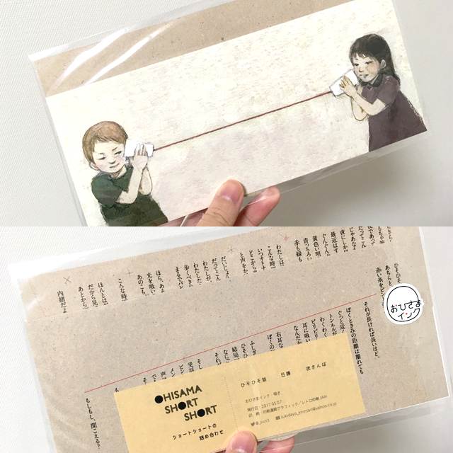 糸電話の横長ポストカードがついています。